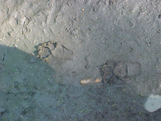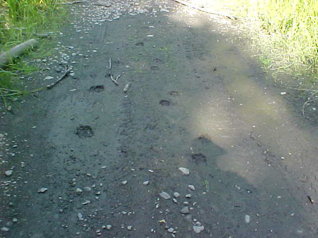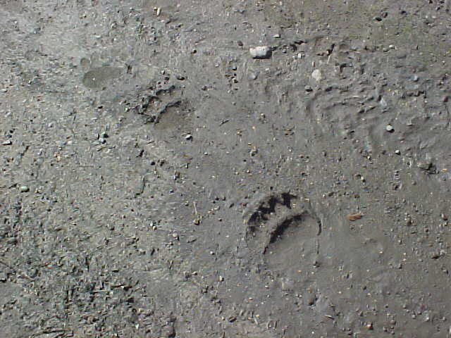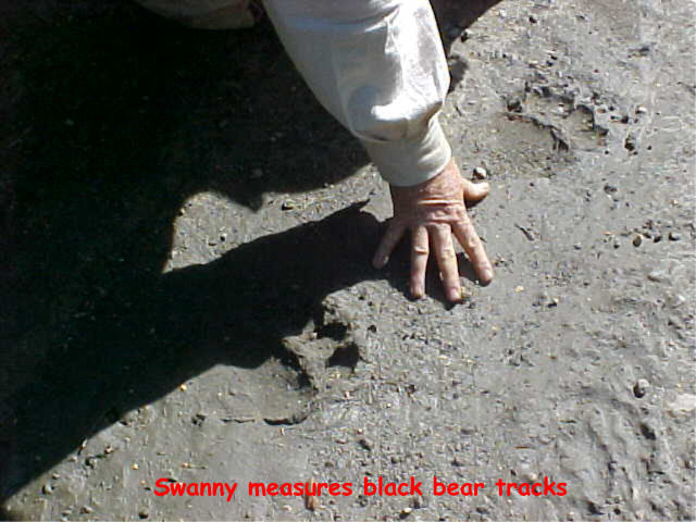 We had been working steadily for some time when Swanny, placing stakes well ahead of the others, observed a set of small moose tracks paralleled by a set of unusually large wolf tracks in the trail. Between the next two stations he observed a set of tracks left by a relatively large black bear. Both sets of tracks were reasonably fresh, certainly within the past 12 hours. The image on the left shows both the moose and wolf tracks, the one at left center is a detail of the wolf tracks, at right center the bear tracks and on the far right shows Swanny's hand in the bear tracks to add a sense of scale.