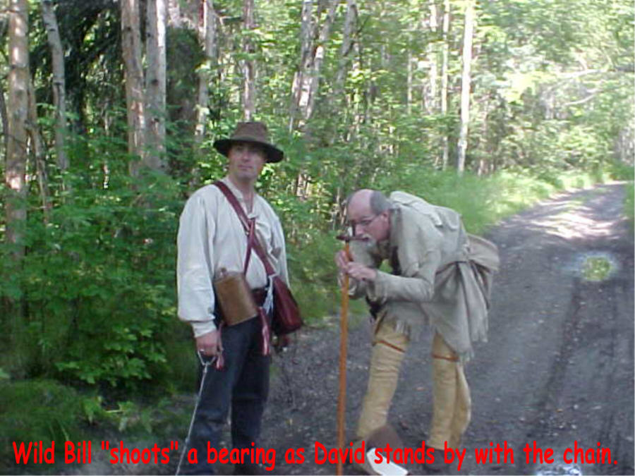 For most of Saturday Swanny served as the lead man, marking the line to be surveyed with staves. Bill started out as the “instrument man” reading the bearings between stations and sighting through the sites (alidade) of the compass to ensure the chainmen did not deviate from the line as they measured the distance between the staves, and recording the bearings and distances in the field book. Later in the day he and David switched roles. The other two men served as chainmen, accurately measuring the distances between stations.